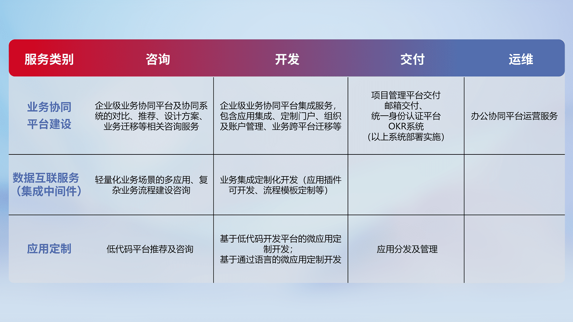 针对钉钉、、、企微、、、IDaas等平台级产品提供产品的规划、、、、方案、、、交付、、定制化开发等服务,,,实现如统一协同办公、、、、智能客户服务、、混合会议管理、、智能数据查询、、、、等业务场景,,,实现数字化转型。。。。